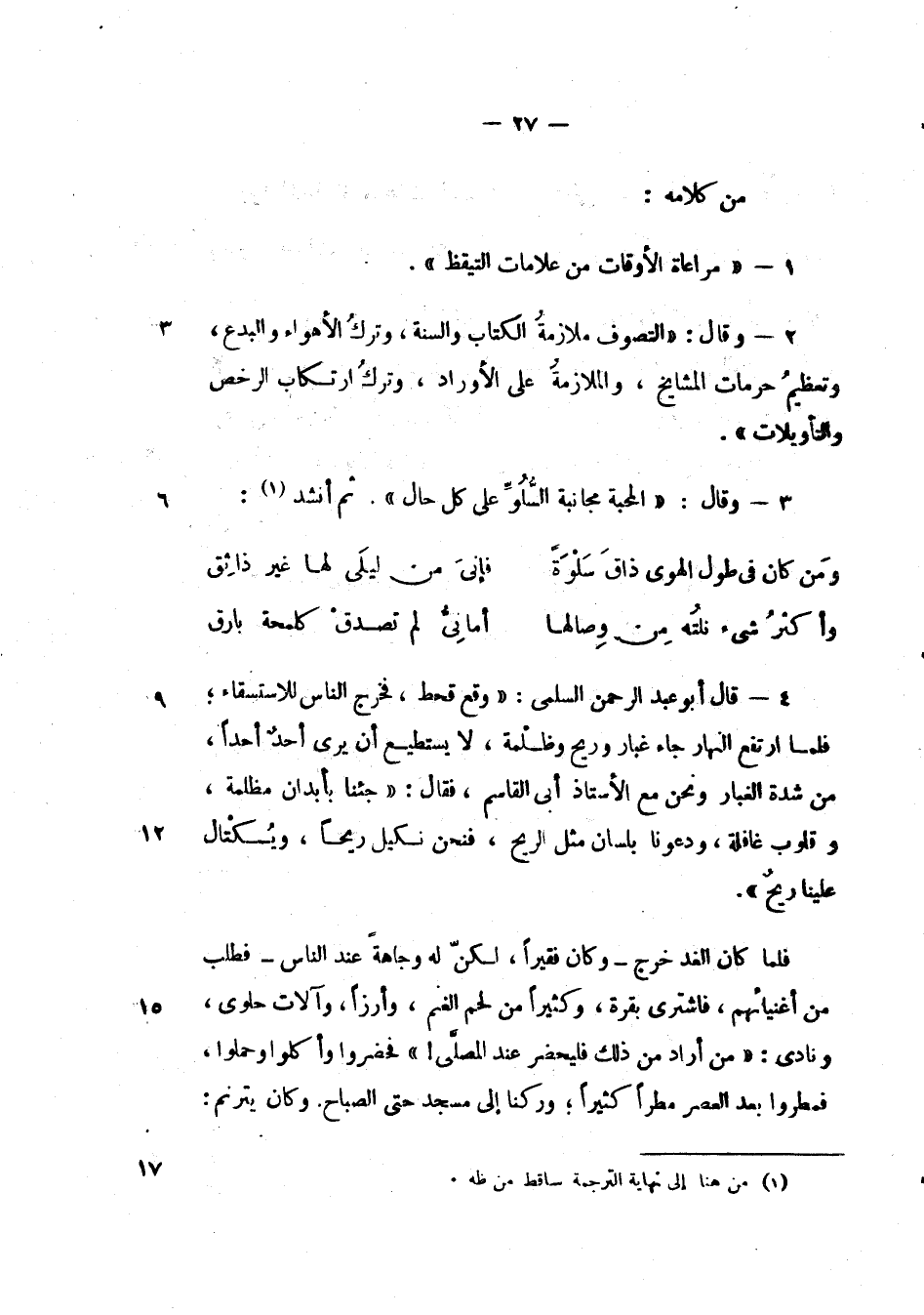 وقال: " التصوف ملازمة الكتاب والسنة، وترك الأهواء والبدع، وتعظيم حرمات المشايخ، والملازمة على الأوراد، وترك ارتكاب الرخص والتأويلات ".