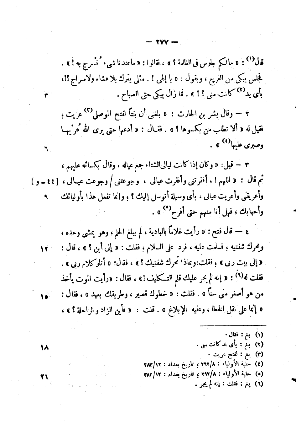 وقال بشر بن الحارث: " بلغني أن بنتاً لفتح الموصلي عريت؛ فقيل له " إلا تطلب من يكسوها؟ ". فقال: " ادعها حتى يرى الله عريها وصبري عليها ".