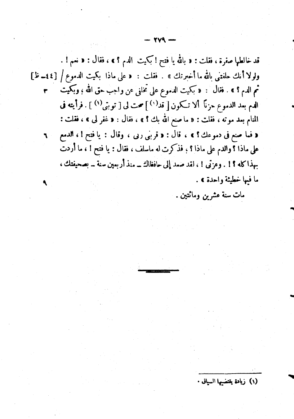 قد غالطها صفرة، فقلت: " بالله يافتح! بكيت الدم؟ "، فقال: " نعم!. ولولا انك حلفتني بالله ما خبرتك ". فقلت: " على ماذا بكيت الدموع ثم الدم؟ ". فقال: " بكيت الدموع على تخلفي عن واجب حق الله؛ وبكيت الدم بعد الدموع حزناً إلا تكون قد صحت لي توبتي1. فرأيته في المنام بعد موته، فقلت: " ما صنع الله بك؟ "، فقال: " غفر لي "، فقلت: " فما صنع في دموع؟ "، قال: " قربني ربي، وقال: يا فتح!، ادمع على ماذا؟ والدم على ماذا؟؛ فذكرت له ما سلف، فقال: يا فتح!، ما أردت بهذا كله؟!. وعزتي!، لقد صعد إلى حافظاك - من أربعين سنة - بصحيفتك، ما فيها خطيئة واحدة ".