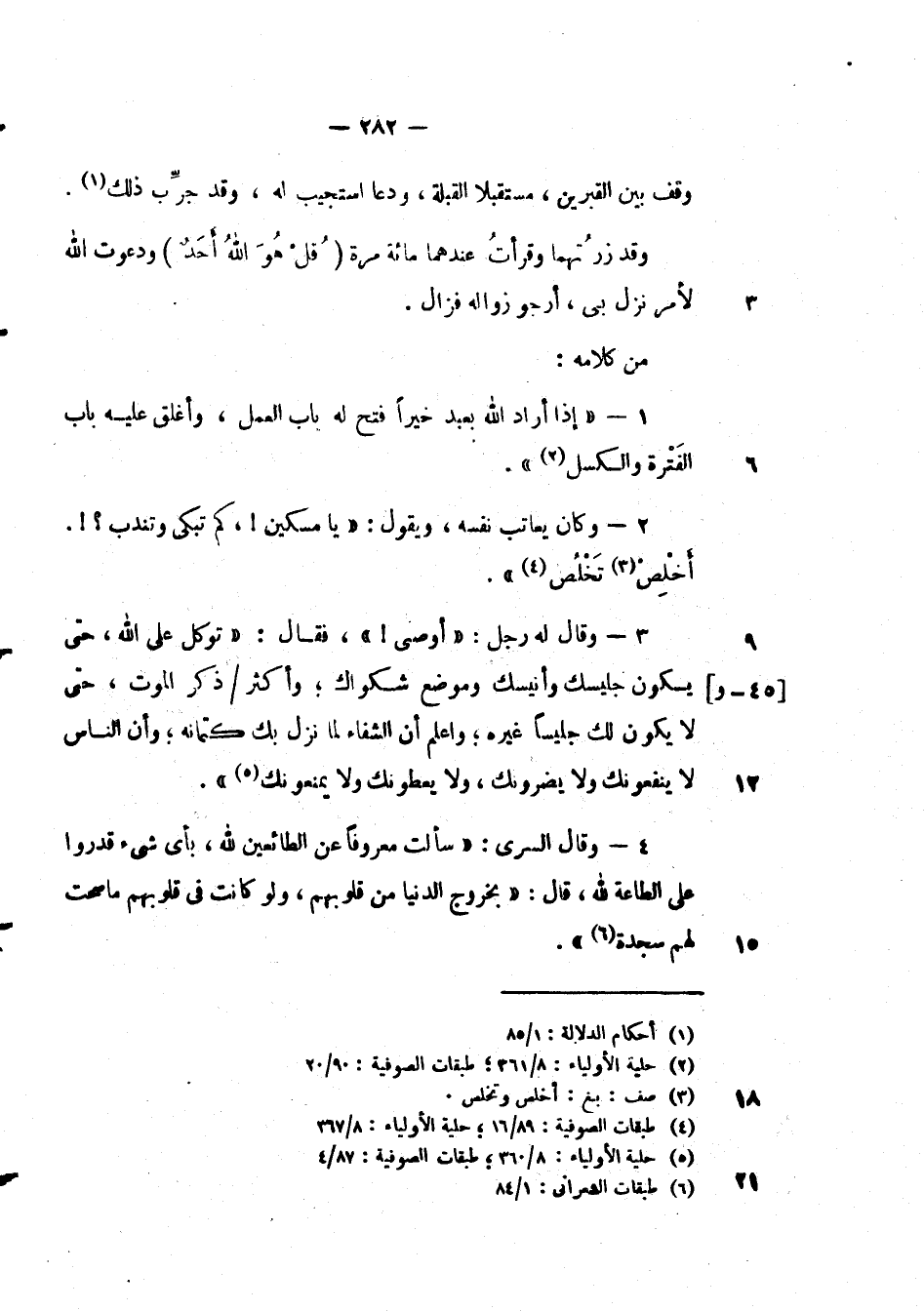 وقال السرى: " سألت معروفاً عن الطائعين لله، بأي شئ قدروا على الطاعة لله، قال: " بخروج الدنيا من قلوبهم، ولو كانت في قلوبهم ما صحت لهم سجدة ".