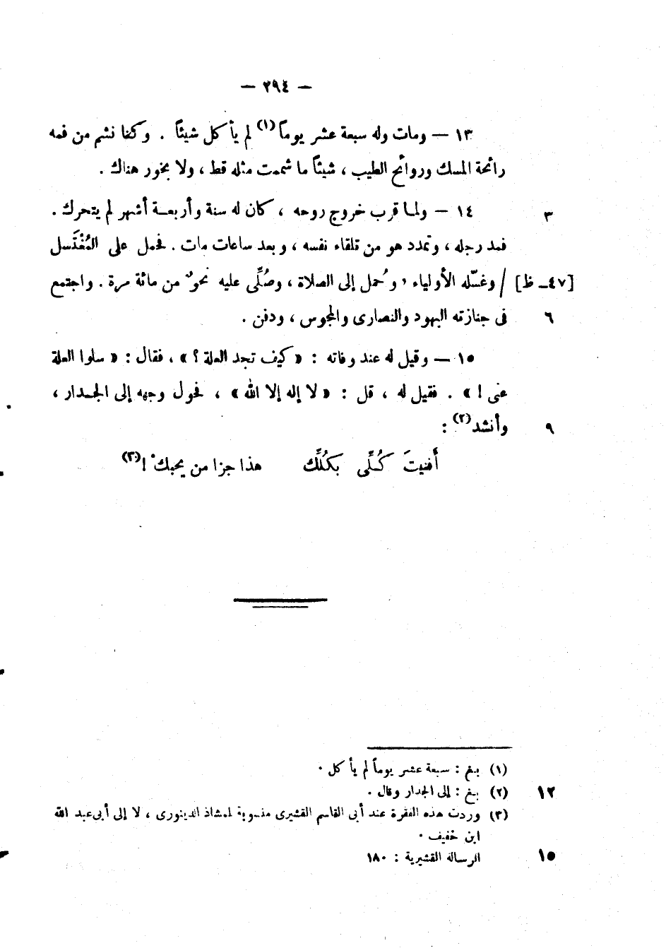 وقيل له عند وفاته: " كيف تجد العلة؟ "، فقال: " سلوا العلة عني! ". فقيل له:، قل: " لا إله إلا الله "، فحول وجهه إلى الجدار، وأنشد: