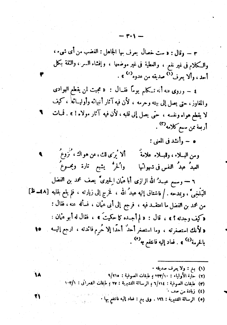 وسمع عبدُ الله الرازي أبا عثمان الحِيريَّ يصف محمد بن الفضل البَلْخِيَّ، ويمدحه. فاشتاق أليه عبدُ الله، فخرج إلى زيارته، فلم يقع بقلبه من محمد بن الفضل ما اعتقد فيه، فرجع إلى أبي عثمان، فسأله عنه، فقال: " كيف وجدته؟ "، قال: " لم أجده كما حكيتَ "، فقال له أبو عثمان: " لأنك استصغرته، وما استصغر أحدٌ أحداً إلا حُرِمَ فائدته، ارجع أليه بالحرمة ". فعاد أليه فانتفع به.