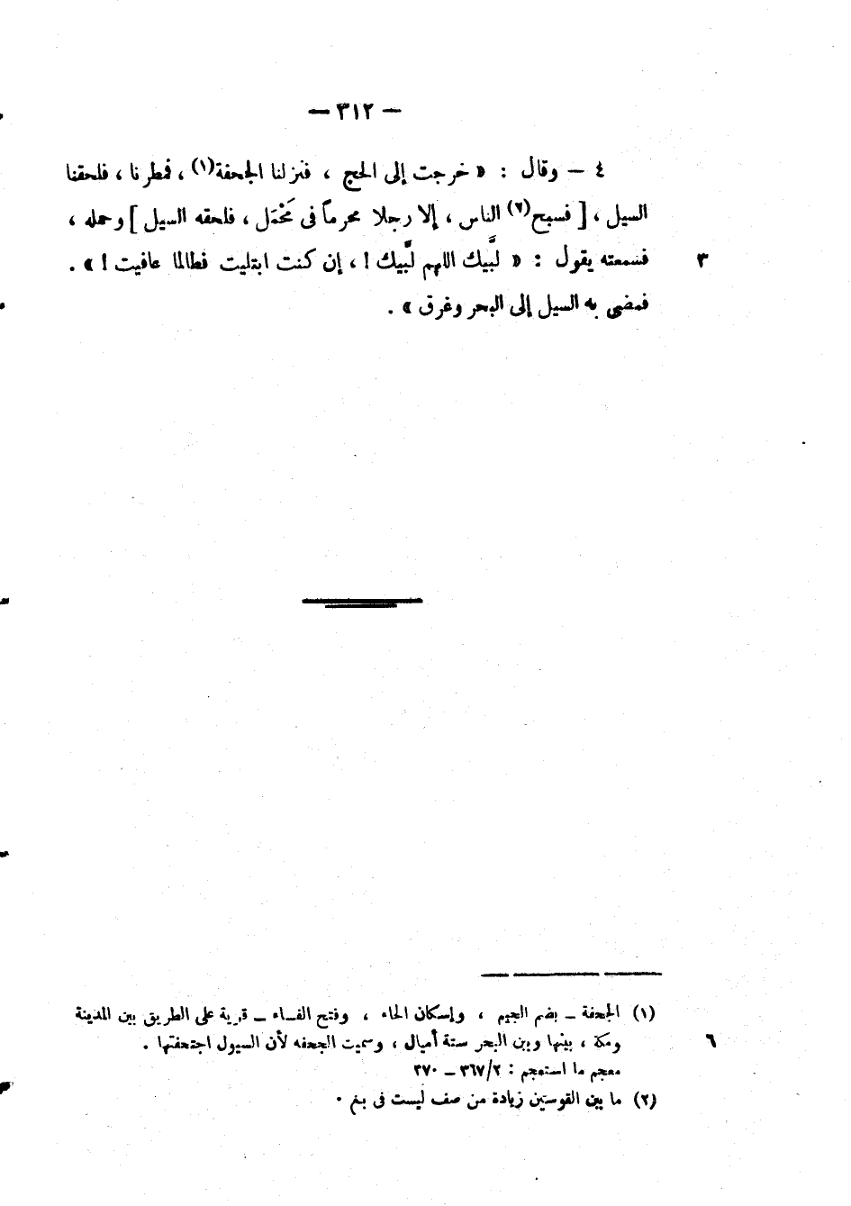 وقال: " خرجت إلى الحج، فنزلنا الجحفة، فمطرنا، فلحقنا السيل،) فسبح الناس، إلا رجلا محرما في محمل، فلحقه السيل (وحمله، فسمعته يقول: " لبيك اللهم لبيك!، ان كنت ابتليت فطالما عافيت! " فمضى به السيل إلى البحر وغرق ".
