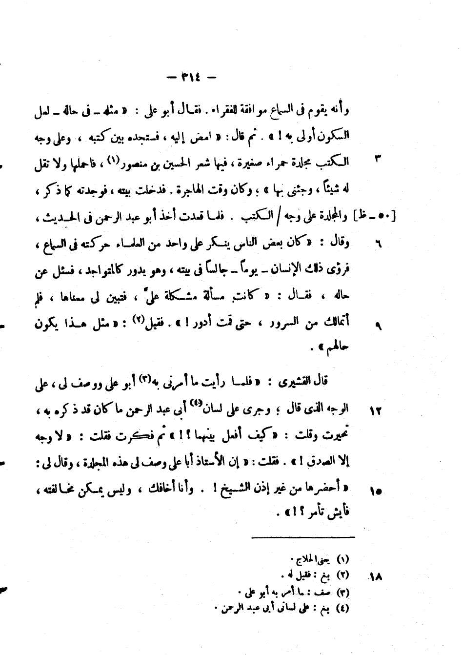 قال القشيري: " فلما رايت ما امرني به أبو على ووصف لي، على الوجه الذي قال؛ وجرى على لسان أبي عبد الرحمن ما كان قد ذكره به، تحيرت وقلت: " كيف افعل بينهما!؟ " ثم فكرت وقلت: " لا وجه إلا الصدق! ". فقلت: " إن الأستاذ أبا علي وصف لي هذه المجلدة، وقال لي: " أحضرها من غير أذن الشيخ!. وأنا اخافك، وليس يمكن مخالفته، فايش تأمر!؟ ".