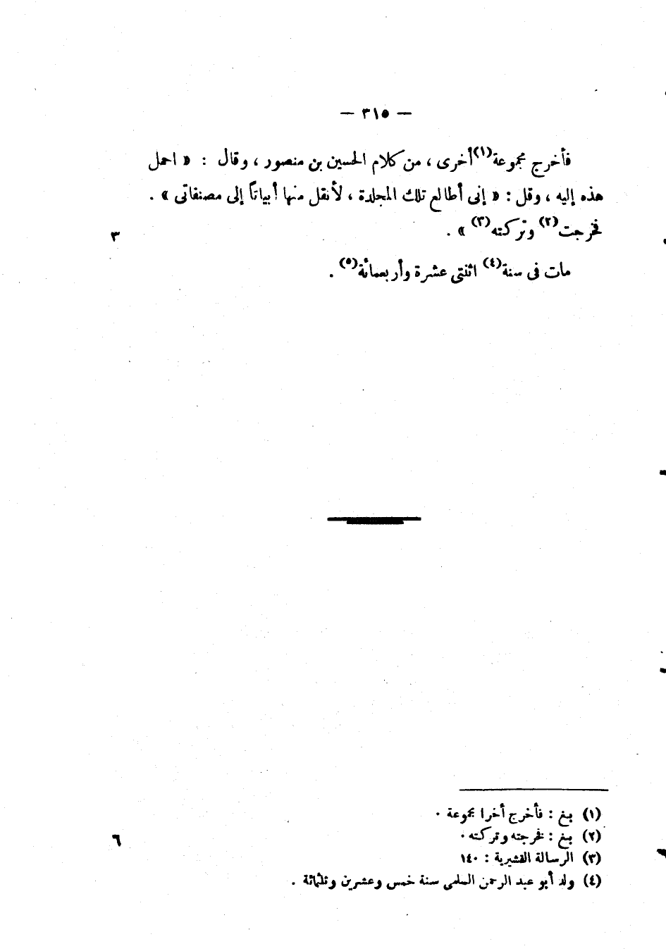 فاخرج مجموعة أخرى، من كلام الحسين بن منصور، وقال: " احمل هذه أليه، وقال) أني أطالع تلك المجلدة لا نقل منها أبياتا إلى مصنفاتي ". فخرجت وتركته ".