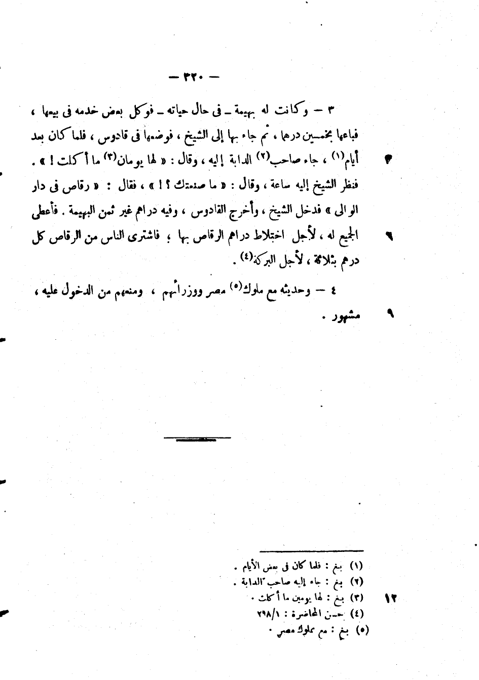 وكانت له بهيمة - في حال حياته - فوكل بعض خدمه في بيعها، فباعها بخمسين درهم، ثم جاء بها إلى الشيخ، فوضعها في قادوس، فلما كان بعد أيام، جاء صاحب الدابة أليه، وقال: " لها يومان ما أكلت! ". فنظر الشيخ أليه ساعة، وقال: " ما صنعتك؟! "، فقال: " رقاص في دار الوإلى " فدخل الشيخ، واخرج القادوس، وفيه دراهم غير ثمن البهيمة. فإعطى الجميع له، لإجل اختلاط دراهم الرقاص بها؛ فاشترى الناس من الرقاص كل درهم بثلاثة، لأجل البركة.