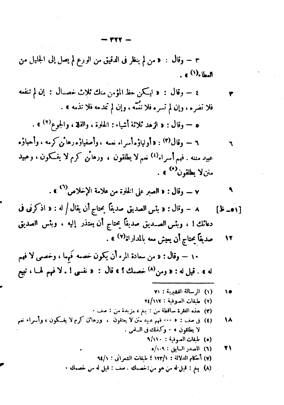 وقال: " أولياؤه أسراء نعمه، وأصفياؤه رهائن كرمه، وأحباؤه عبيد مننه. فهم أسراء نعم لا يطلقون، ورهائن كرم لا يفكون، وعبيد منن لا يطلقون ".