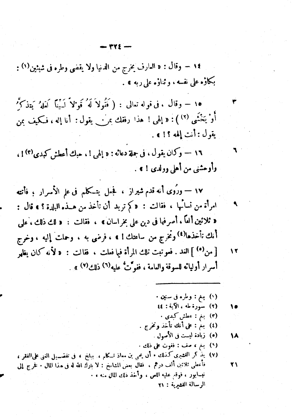 وكان يقول، في جملة دعائه: " الهي!، حبك اعطش كبدي!، وأوحشني من أهلي وولدي! " وروى انه قدم شيراز، فجعل يتكلم في علم الأسرار؛ فاتته أمراءه من نسائها، فقالت: " كم تريد أن تأخذ من هذه البلدة؟ " قال: " ثلاثين ألفا، اصرفها في دين على بخراسان "، فقالت: " لك ذلك، على انك تأخذها وتخرج من ساعتك! "، فرضى به، وحملت اليه، وخرج من الغد. فعوتبت تلك المرأة فيما فعلت، فقالت: " لأنه كان يظهر أسرار أوليائه للسوقة والعامة، ففوت عليه ذلك ".