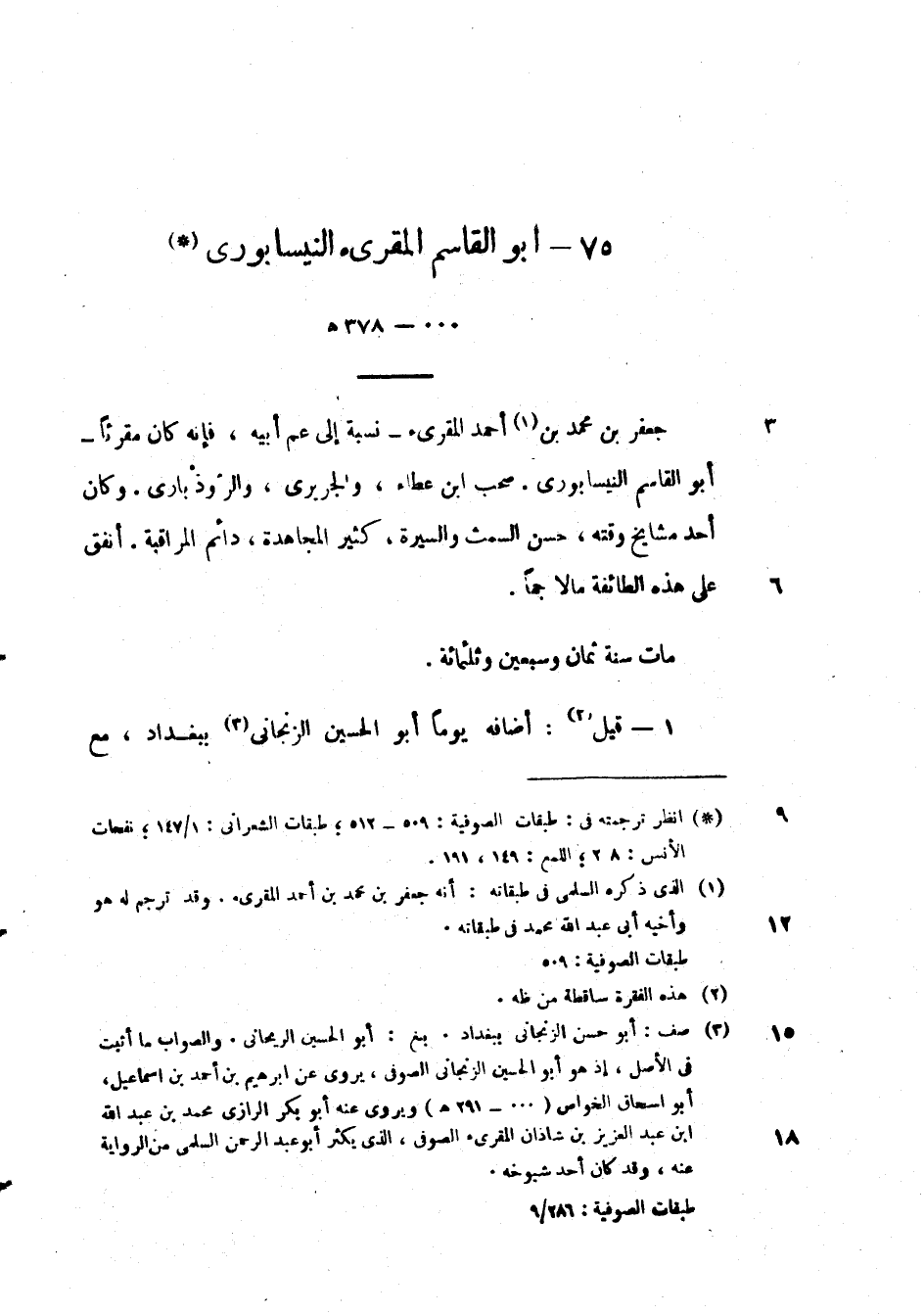 جعفر بن محمد بن احمد المقرئ - نسبة إلى عم أبيه، فانه كان مقرئاً - أبو القاسم النيسابوري. صحب ابن عطاء، والجريري، والروذباري. وكان أحد مشايخ وقته، حسن السمث والسيرة، حسن السمث والسيرة، كثير المجاهدة، دائم المراقبة. انفق على هذه الطائفة مالا جماً.