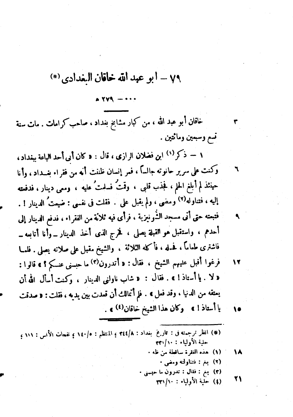ذكر ابن فضلان الرازي، قال: " كان أبي أحد الباعة ببغداد، وكنت على سرير حانوته جالساً، فمر إنسان ظننت انه من فقراء بغداد، وان حين إذ لم ابلغ الحلم، فجذب قلبي، وقمت فسلمت عليه، ومعي دينار، فدفعت اليه، فتناوله ومضى، ولم يقبل علي فقلت في نفسي: ضيعت الدينار؟. فتبعته حتى أتى مسجد الشونيزية، فرأى في ثلاثة من الفقراء، فدفع الدينار إلى احدهم، واستقبل هو القبلة يصلي، فخرج الذي اخذ الدينار - وأنا أتابعه - فأشترى طعاماً، فحمله، فأكله ثلاثة، والشيخ مقبل على صلاته يصلي. فلم فرغوا اقبل عليهم الشيخ، فقال: " أتدرون ما حبسني عنكم؟ " قالوا: " لا. يا أستاذ! ". فقال: " شاب ناولني الدينار، وكنت أسأل الله ان يعتقه من الدنيا، وقد فعل ". فلم أتمالك ان قعدت بين يديه، فقلت: " صدقت يا أستاذ! ". وكان هذا الشيخ خاقان ".