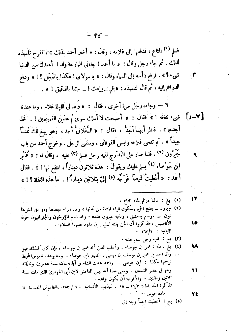 وجاءه رجل مرة أخرى، فقال: " ولد لى الليلة غلام، وما عندنا شىء ننفقه! " فقال: " أصبحت لا املك سوى هذين القميصين!. فخذ أحدهما ". فنظر أيهما أجد، فقال: " السفلاني أجد، وهو يبلغ لك ثمناً جيداً ". ثم تنحى فنزعه ولبس الفوقاني، ومضى الرجا. وخرج أحمد من باب جيرون، فلما صار على المدرج لقيه رجل فسلم عليه، وقال له: " عمير ابن جوصاء يسلم عليك ويقول: ثلاثون ديناراً، انتفع بها! ". فقال احمد: " أعطيت قميصاً فوجه إلى بثلاثين ديناراً!. ما هذه الغفلة؟! "