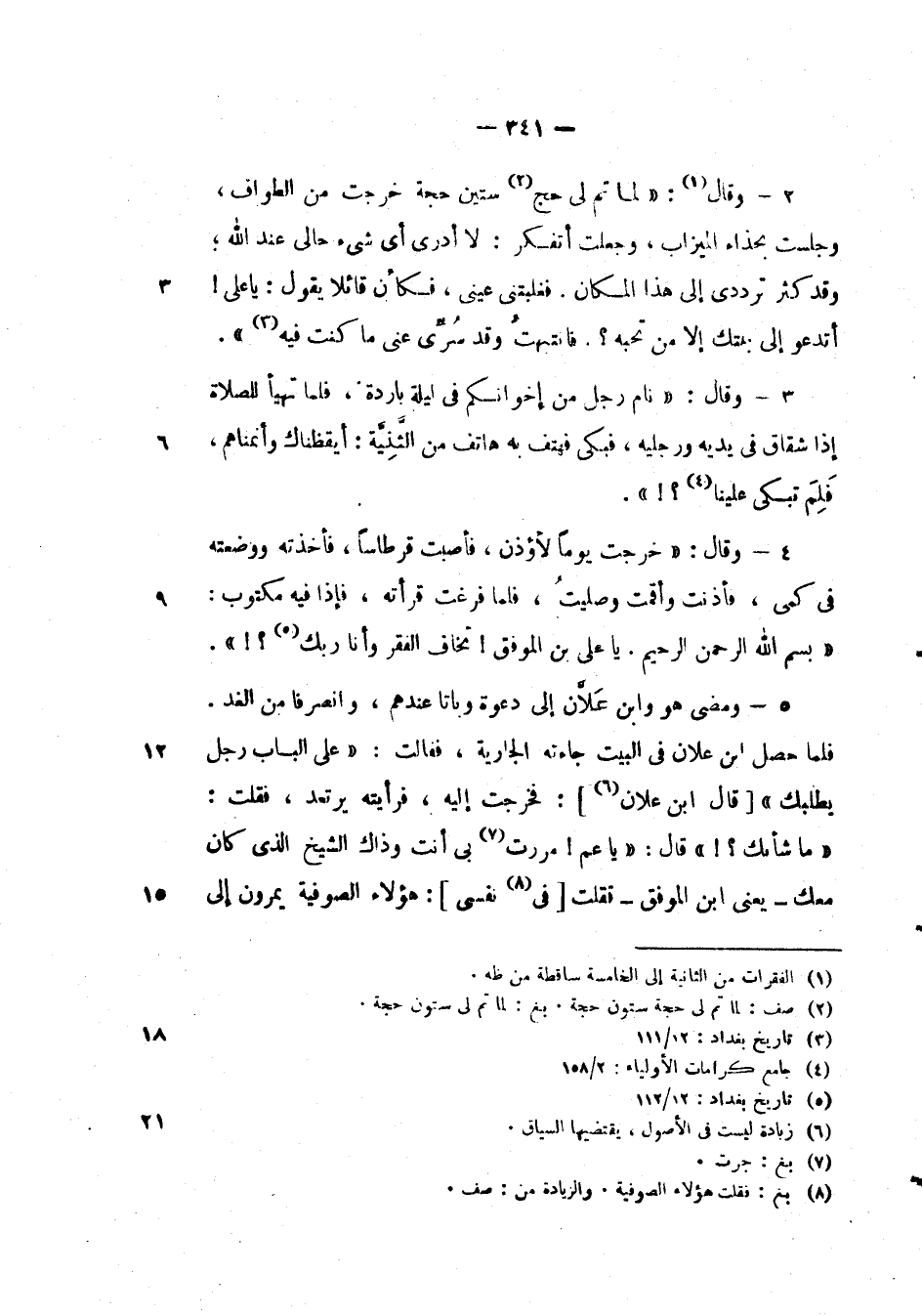 ومضى هو وابن علان إلى دعوة وباتا عندهم، وانصرفا من الغد. فلما حصل ابن علان في البيت جاءته الجارية، فقالت: " على الباب رجل يطلبك " قال ابن علان: فخرجت إليه فرايته يرتعد، فقلت: " ما شأنك؟! " قال: " يا عم! مررت بي أنت وذاك الشيخ الذي كان معك - يعنى ابن الموفق - فقلت في نفسي: هؤلاء الصوفية يمرون إلى