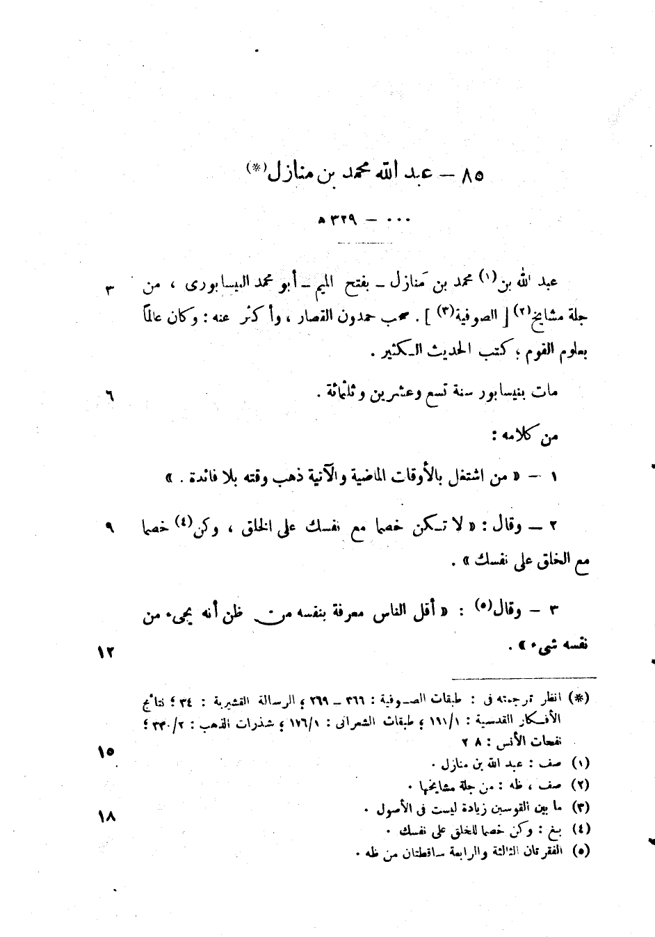 عبد الله بن منازل - بفتح الميم - أبو محمد النيسأبوري، من جله مشايخ الصوفية. صحب حمدون القصار، وأكثر عنه: وكان عالماً بعلوم القوم؛ كتب الحديث الكثير.