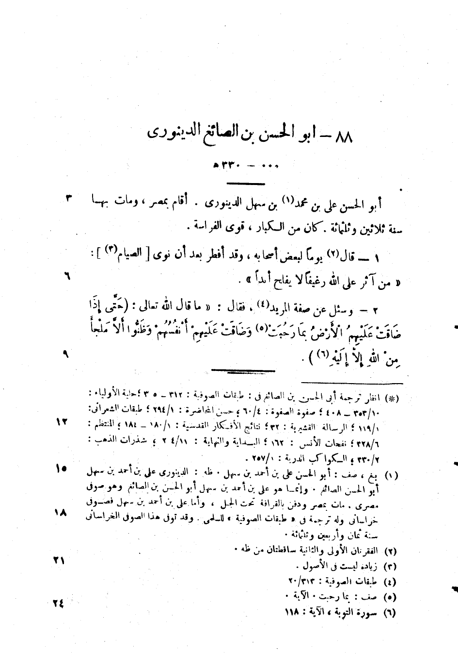 وسئل عن صفة المريد، فقال: " ما قال الله تعالى:) حتى إذا ضاقت عليهم الأرض بما رحبت وضاقت عليهم أنفسهم وظنوا إلا ملجأ من الله إلا إليه (.