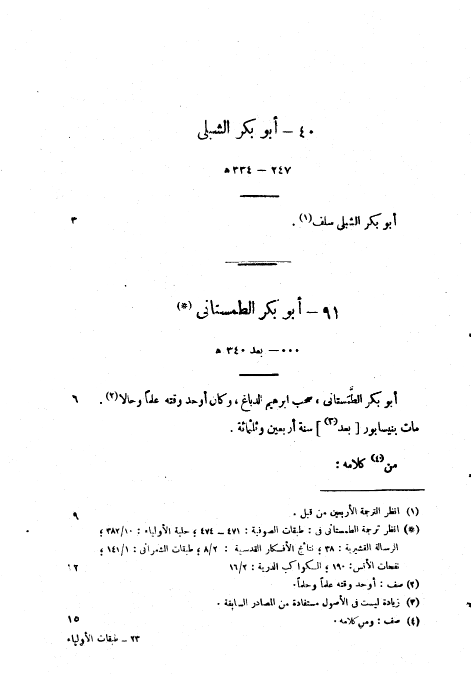 أبو بكر الطمستانى، صحب ابرهيم الدباغ، وكان أوحد وقته علماً وحالا. مات بنيسأبور بعد سنة أربعين وثلثمائة.