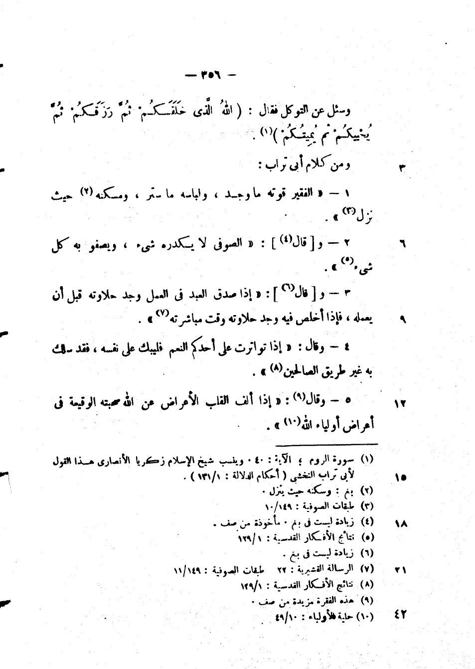 ومن كلامه أبى تراب: " الفقير قوته ما وجد، ولباسه ما ستر، ومسكنه حيث نزل ".