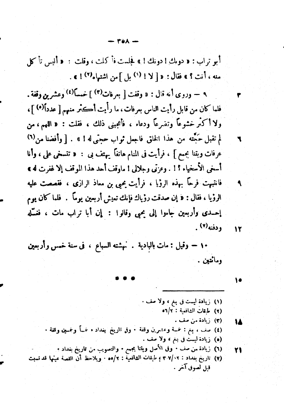 وروى أنه قال: " وقفت بعرفات خمساً وعشرين وقفة. فلما كان من قابل رأيت الناس بعرفات، ما رأيت أكثر منهم عدداً، ولا أكثر خشوعاً وتضرعاً ودعاء، فاعجبنى ذلك، فقلت: " اللهم، من لم تقبل حجته من هذا الخلق فأجعل ثواب حجتي له! ". وأفضنا من عرفات وبتنا بجمع، فرأيت في المنام هاتفاً يهتف بى: " تتسخى على، وأنا أسخى الأسخياء؟!. وعزتي وجلالي! ما وقف أحد هذا الموقف إلا غفرت له " فانتبهت فرحاً بهبة الرؤيا، فرأيت يحيى بن معاذ الرازى، فقصصت عليه الرؤيا، فقال: " إن صدقت رؤياك فإنك تعيش أربعين يوماً. فلما كان يوم إحدى وأربعين جاءوا إلى يحيى وقالوا: إن أبا تراب مات، فغسله ودفنه.