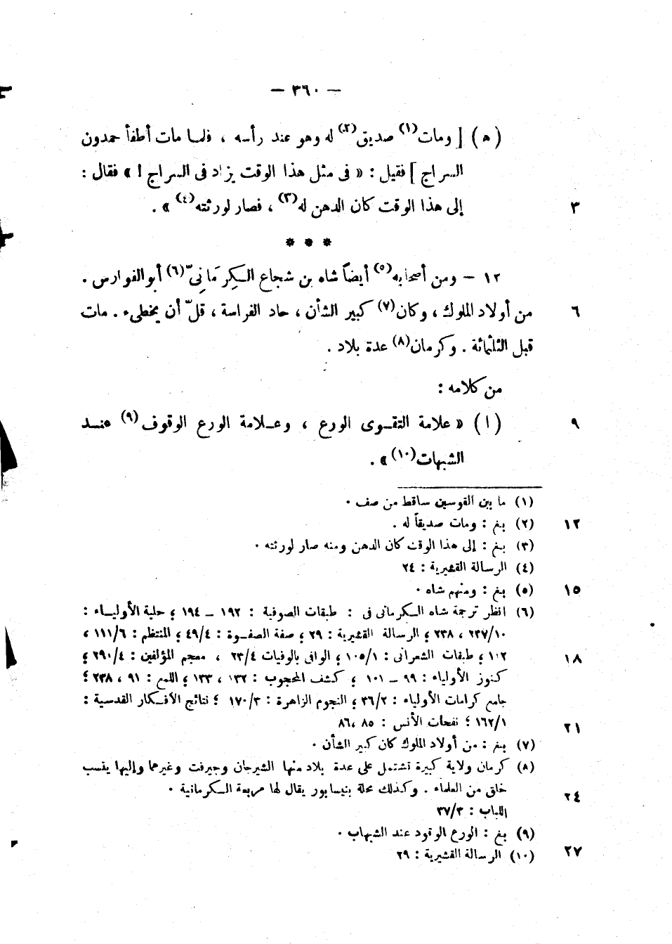 ومن أصحابه أيضاً شاه بن شجاع الكرماني أبو الفوارس. من أولاد الملوك، وكان كبير الشأن، حاد الفراسة، قل أن يخطئ. مات قبل الثلثمائة. وكرمان عدة بلاد. ومن كلامه: " علامة التقوى الورع، وعلامة الورع الوقوف عند الشبهات ".