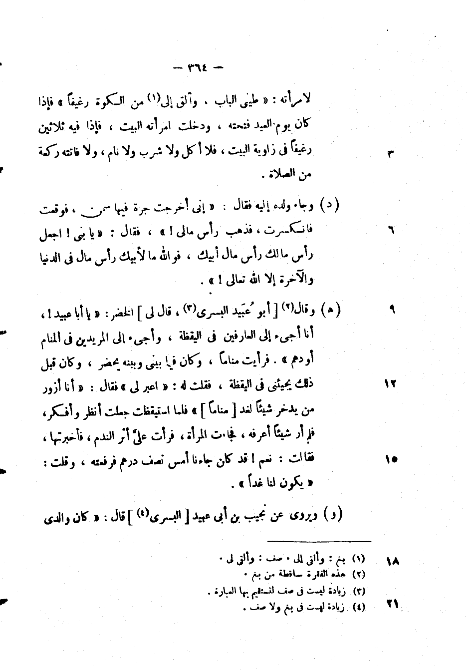 لامرأته: " طيني الباب، وألق إلى من الكوة رغيفاً " فإذا كان يوم العيد فتحته، ودخلت امرأته البيت، فإذا فيه ثلاثين رغيفاً في زاوية البيت، فلا أكل ولا شرب ولا نام، ولا فاتته ركعة من الصلاة.