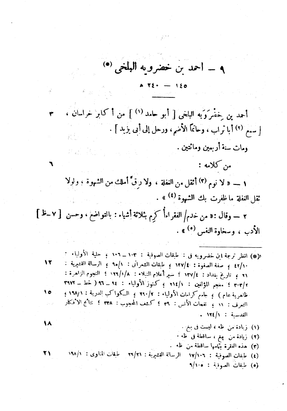 أحمد بن خضرويه البلخي أبو حامد من أكابر خراسان سمع أبا تراب، وحاتماً الأضم، ورحل إلى أبى يزيد.