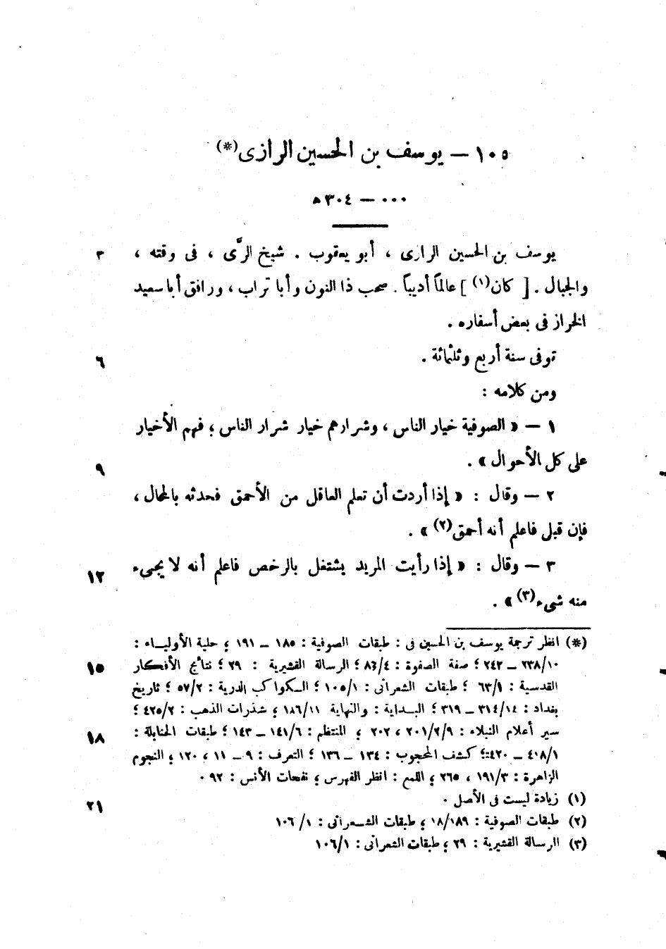 يوسف بن الحسين الرازي، أبو يعقوب. شيخ الرى، في وقته، والجبال.) كان (عالما أديبا. صحب ذا النون وأبا تراب، ورافق أبا سعيد الخراز في بعض أسفاره.