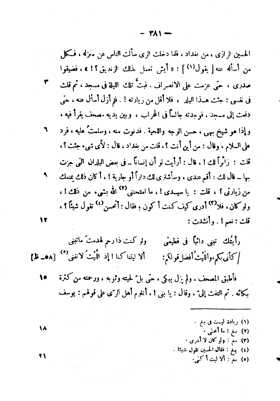 الحسين الرازي، من بغداد، فلما دخلت الري سالت عن منزله، فكل من أساله عنه يقول: " ايش تعمل بذلك الزنديق؟؟ "، فضيقوا صدري، حتى عزمت على الانصراف. فبت تلك الليلة في مسجد، ثم قلت في نفسي: جئت هذا البلد، فلا اقل من زيارته. فلم أزل أسال عنه، حتى دفعت إلى مسجد، فوجدته جالسا في المحراب، وبين يديه مصحف يقرا فيه، وإذا هو شيخ بهي، حسن الوجه واللحية. فدنوت منه، وسلمت عليه، فرد على السلام، وقال: من انت؟ قلت من بغداد، قال: لاي شي جئت؟، قلت: زائرا لك، قال: أرايت لو إن أنسانا - في بعض البلدان التي جزت بها - قال لك: أقم عندي، وسأشتري لك دارا أو جارية، أكان ذلك يمنعك من زيارتي؟، قلت: ياسيدي، ما أمتحنني الله بشي من ذلك ". ولو كان، فلا ادري كيف كنت أكون؛ فقال: أتحسن تقول شيئا؟، قلت: نعم. وانشدت: