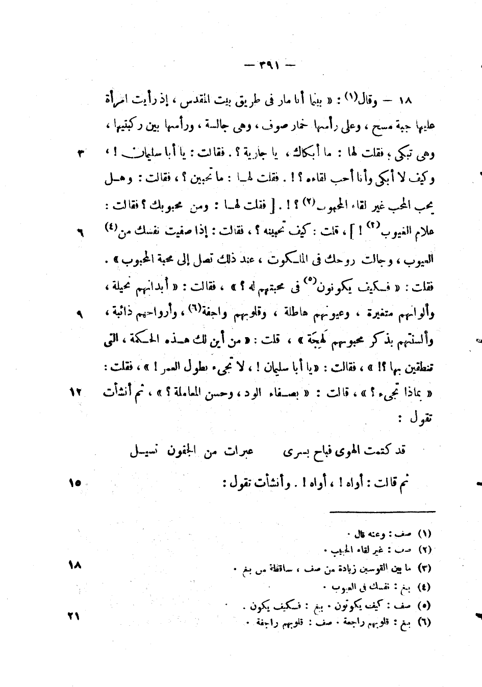 وقال: " بينما أنا مار في طريق بيت المقدس، إذ رأيت امرأة عليها جبة مسح، وعلى رأسها خمار صوف، وهي جالسة، ورأسها بين ركبتيها، وهي تبكي؛ فقلت لها: ما أبكاكِ، يا جارية؟. فقالت: يا أبا سليمان؛ وكيف لا ابكي وأنا احب لقائه؟!. فقلت لها ما تحبين؟، فقالت: وهل يحب المحب غير لقاء المحبوب؟!. فقلت لها: ومن محبوبك؟ فقالت: علام الغيوب!، قلت: كيف تحبينه؟، فقالت: إذا صفيت نفسك من العيوب، وجالت روحك في الملكوت، عند ذلك تصل إلى محبة المحبوب ". فقلت: " فكيف يكونون في محبتهم له؟ "، فقالت: " أبدانهم نحيلة، وألوانهم متغيرة، وعيونهم هاطلة، وقلوبهم واجفة، وأرواحهم ذائبة، وألسنتهم بذكر محبوبهم لهجة "، قلت: " من أين لك هذه الحكمة، التي تنطقين بها؟! "، فقالت: " يا أبا سليمان!، لا تجيئ بطول العمر! ". فقلت: " بماذا تجئ؟ "، قالت: " بصفاء الود، وحسن المعاملة؟ "، ثم أنشأت تقول: