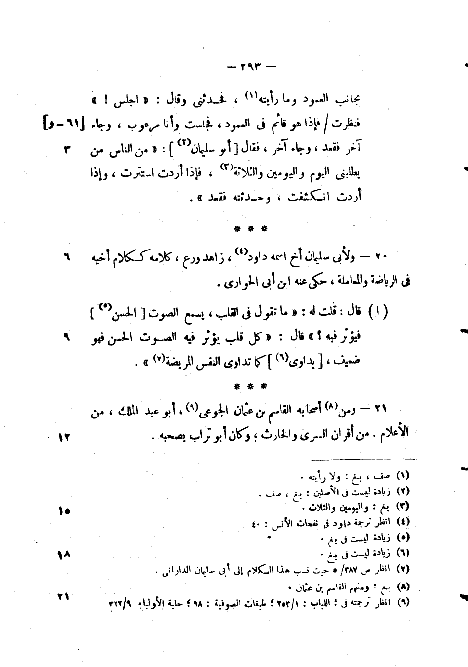 بجانب العمود وما رأيته، فحدثني وقال: " اجلس! " فنظرت فإذا هو قائم في العمود، فجلست وأنا مرعوب، وجاء اخر فقعد، وجاء اخر، فقال أبو سليمان: " من الناس من يطلبني اليوم واليومين والثلاثة، فإذا اردت استترت، وإذا اردتم انكشفت، وحدثته فقعد ".