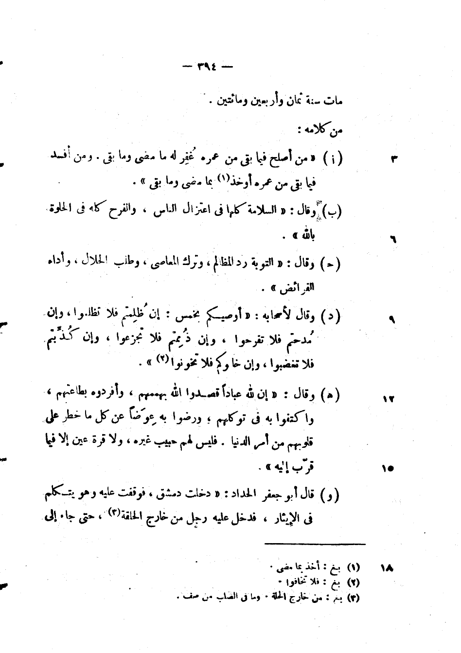 وقال: " التوبة رد المضالم، وترك المعاصي، وطلب الحلال، وأداء الفرائض ".
