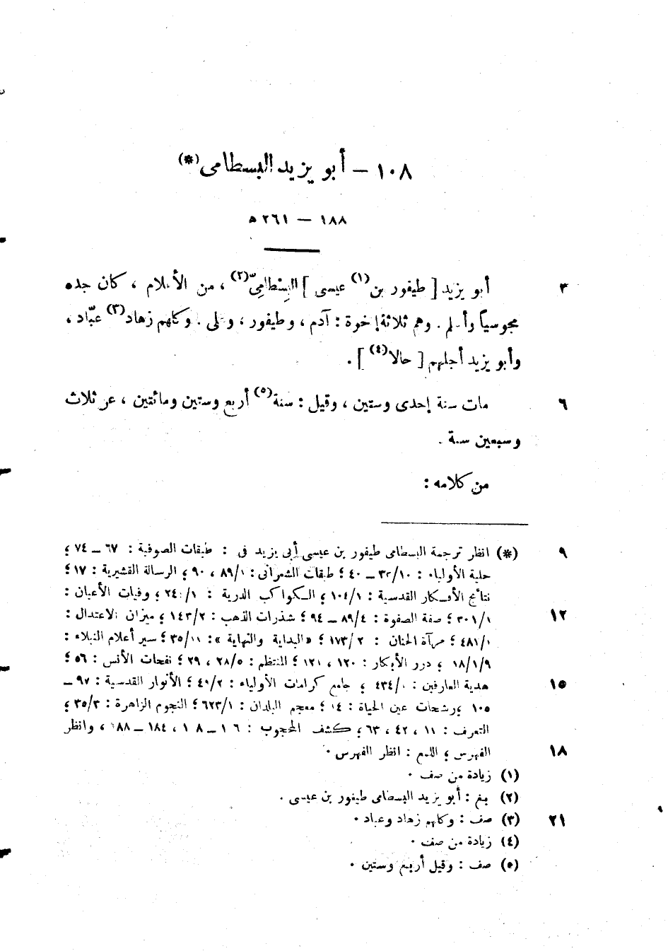 أبو يزيد طيفور بن عيسى البِسْطامِيّ، من الأعلام كان جده مجوسياً وأسلم. وهم ثلاثة إخوة، وطيفور، وعلى. وكلهم زهاد عّباد، وأبو يزيد أجلهم حالا.