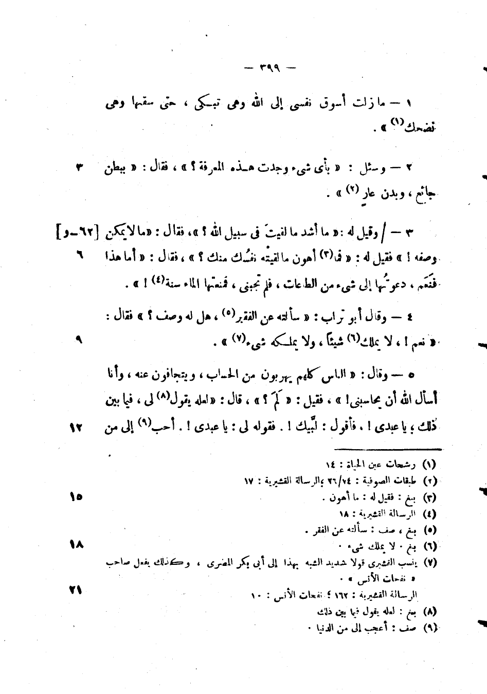 وقال أبو تراب: " سألته عن الفقير، هل له وصف؟ " فقال: " نعم!، لا يملك شيئاً، ولا يملكه شيء ".