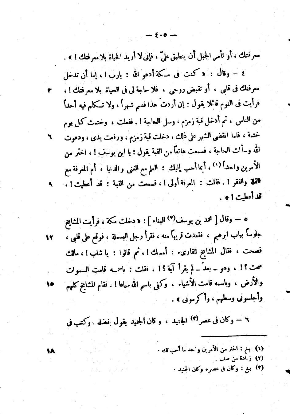 وقال " كنت في مكة أدعو الله: يا رب!، أما ان تدخل معرفتك في قلبي، أو تقبض روحي، فلا حاجة لي في الحياة بلا معرفتك!، من الناس، ثم ادخل قبة زمزم، وسل الحاجة!. ففعلت، وختمت كل يوم ختمة، فلما انقضى الشهر على ذلك، دخلت قبة زمزم، ورفعت يدي، ودعوت الله وسألت الحاجة، فسمعت من القبة يقول: يا ابن يوسف!، اختر من الأمرين واحداً، أيما احب إليك: العلم مع الغني والدنيا، ام المعرفة مع القلة والفقر!. فقلت: المعرفة أولى، فسمعت من القبة: قد أعطيت!، قد أعطيت! ".