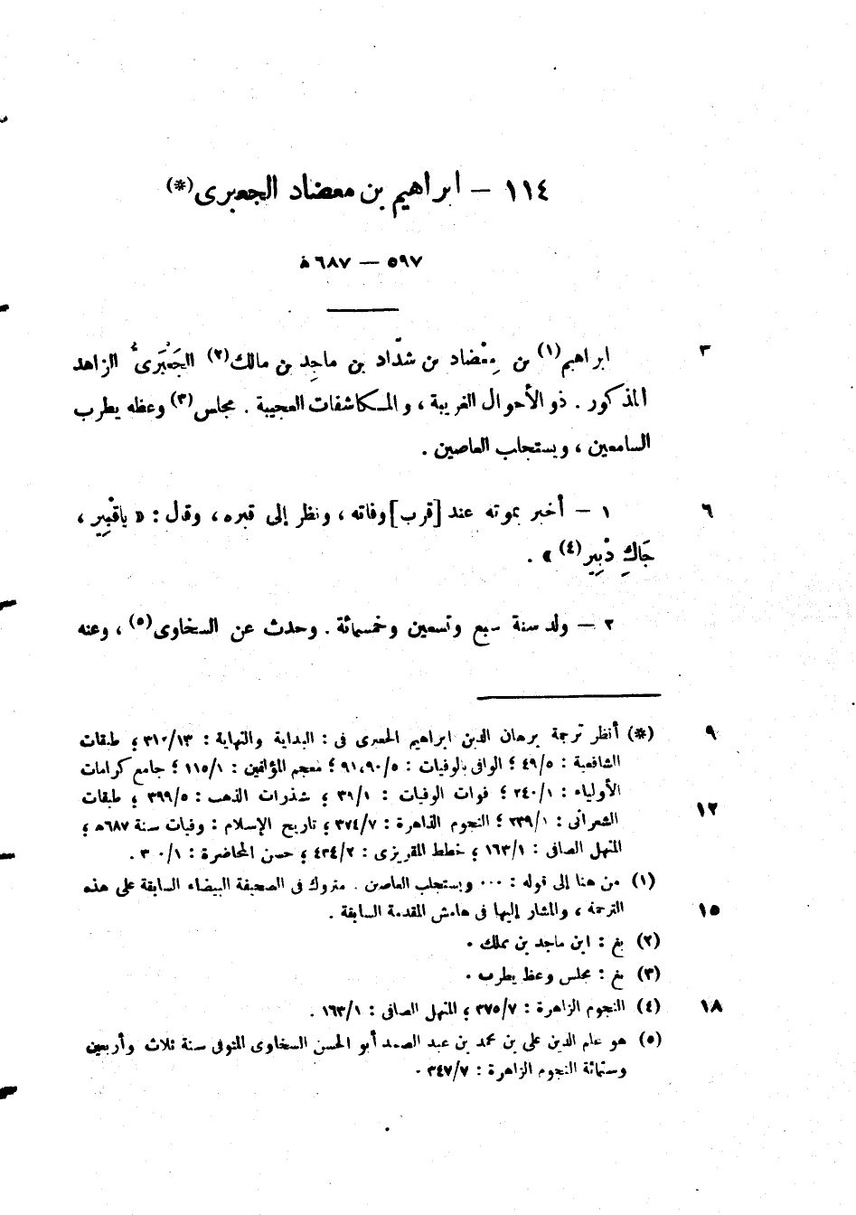 ابراهيم بن معضاد بن شداد بن ماجد بن مالك الجعبري الزاهد المذكور. ذو الأحوال الغريبة، والمكاشفات العجيبة. مجلس، وعظه يطرب السامعين ويستجلب العاصين.