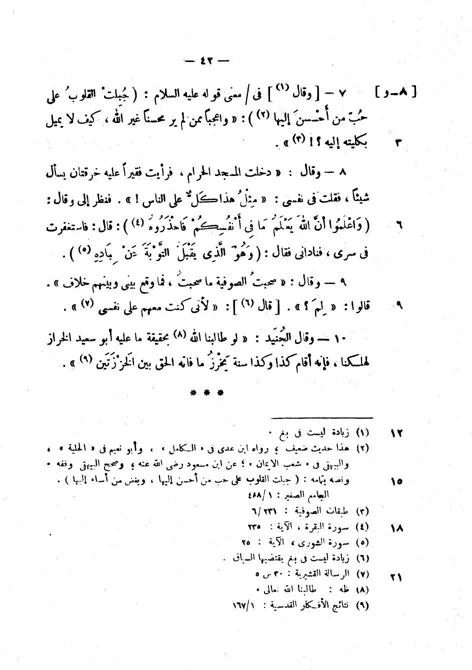 وقال: " صحبت الصوفية ما صحبت، فما وقع بيني وبينهم خلاف ". قالوا: " لم؟ ". قال: " لأني كنت معهم على نفسي ".