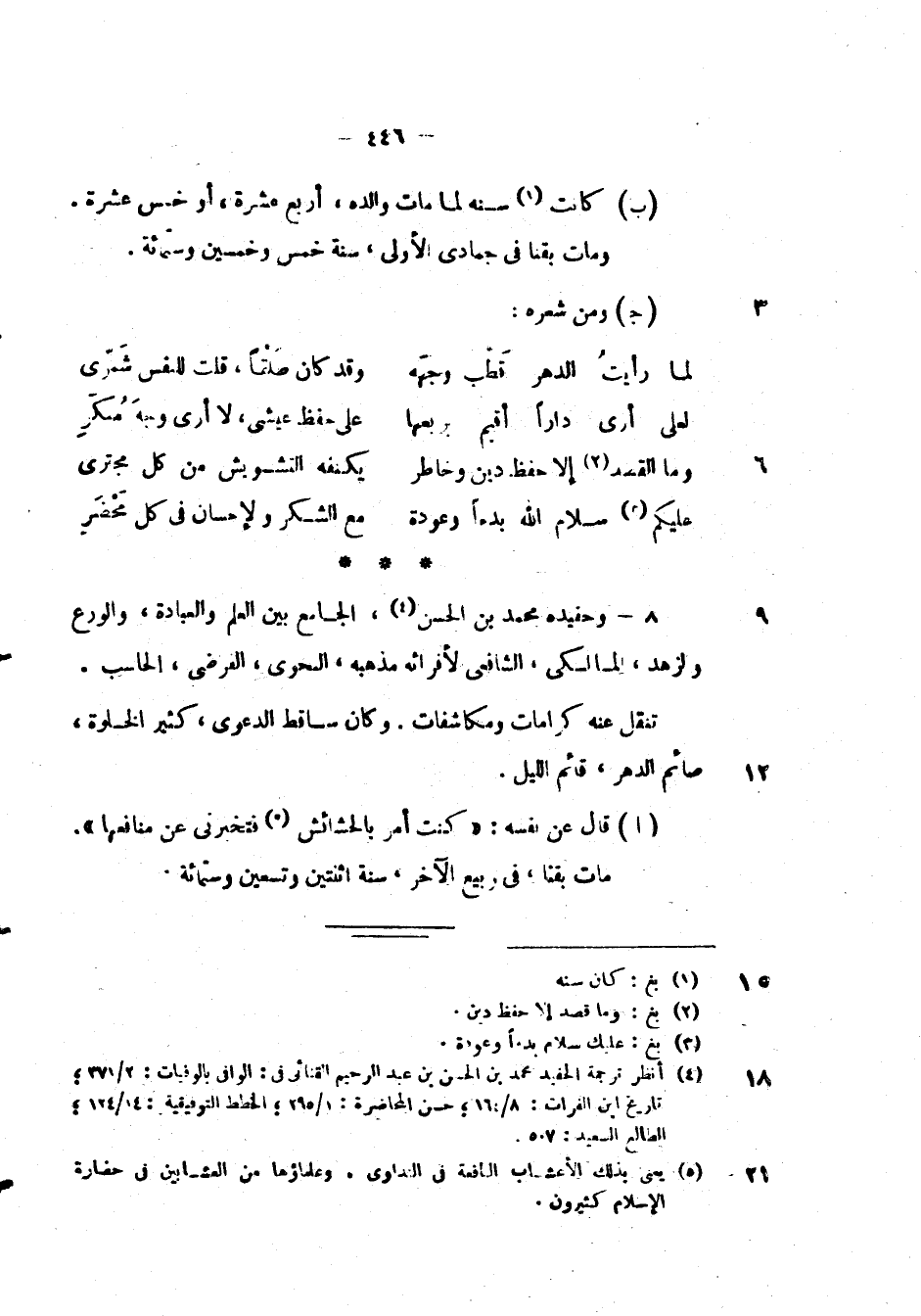 وحفيده محمد بن الحسن، الجامع بين العلم والسيادة، والورع والزهد، المالكي، الشافعي لاقرانه مذهبه، النحوي، الفرضي، الحاسب تنقل عنه كرامات ومكاشفات. وكان ساقط الدعوى، كثير الخلوة، صائم الدهر، قائم الليل.