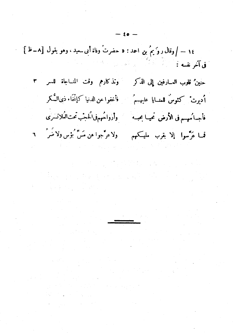 وقال: رويم بن أحمد: " حضرت وفاة ابي سعيد في آخر نفسه: