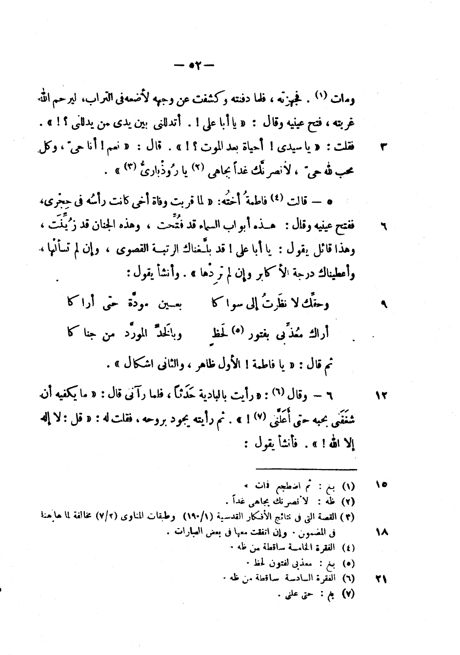 وقال: " رأيت بالبادية حدثاً، فلما رآني قال: " ما يكفيه أن شغفني بحبه حتى أعلني! ". ثم رأيته يجود بروحه، فقلت له: " قل: لا اله إلا الله! ". فأنشأ يقول: