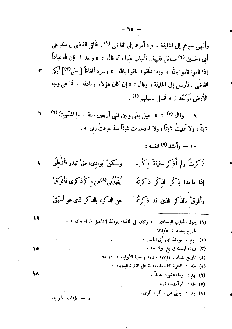 وأنهى خبرهم إلى الخليفة، فرد أمرهم إلى القاضي. فألقى القاضي يومئذ على أبى الحسين مسائل فقهية. فأجاب عنها، ثم قال: " وبعد! فان لله عباداً اذا قاموا قاموا بالله، واذا نطقوا نطقوا بالله! " وسرد ألفاظاً حتى أبكى القاضى. فأرسل إلى الخليفة، وقال: " إن كان هؤلاء زنادقة، فما على وجه الأرض موحد! " فخلى سبيلهم.