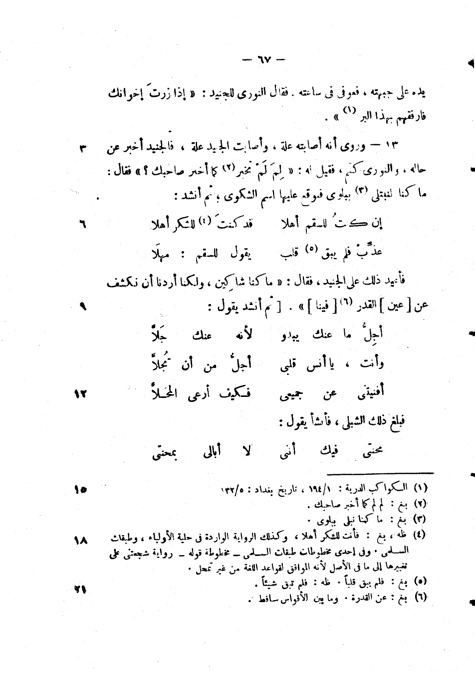 وروى أنه أصابته علة، وأصابت الجنيد علة، فالجنيد أخبر عن حاله، والنورى كتم، فقيل له: " لم لم تخبر كما اخبر صاحبك؟ " فقال: ما كنا لنبتلى ببلوى فنوقع عليها اسم الشكوى؛ ثم أنشد: