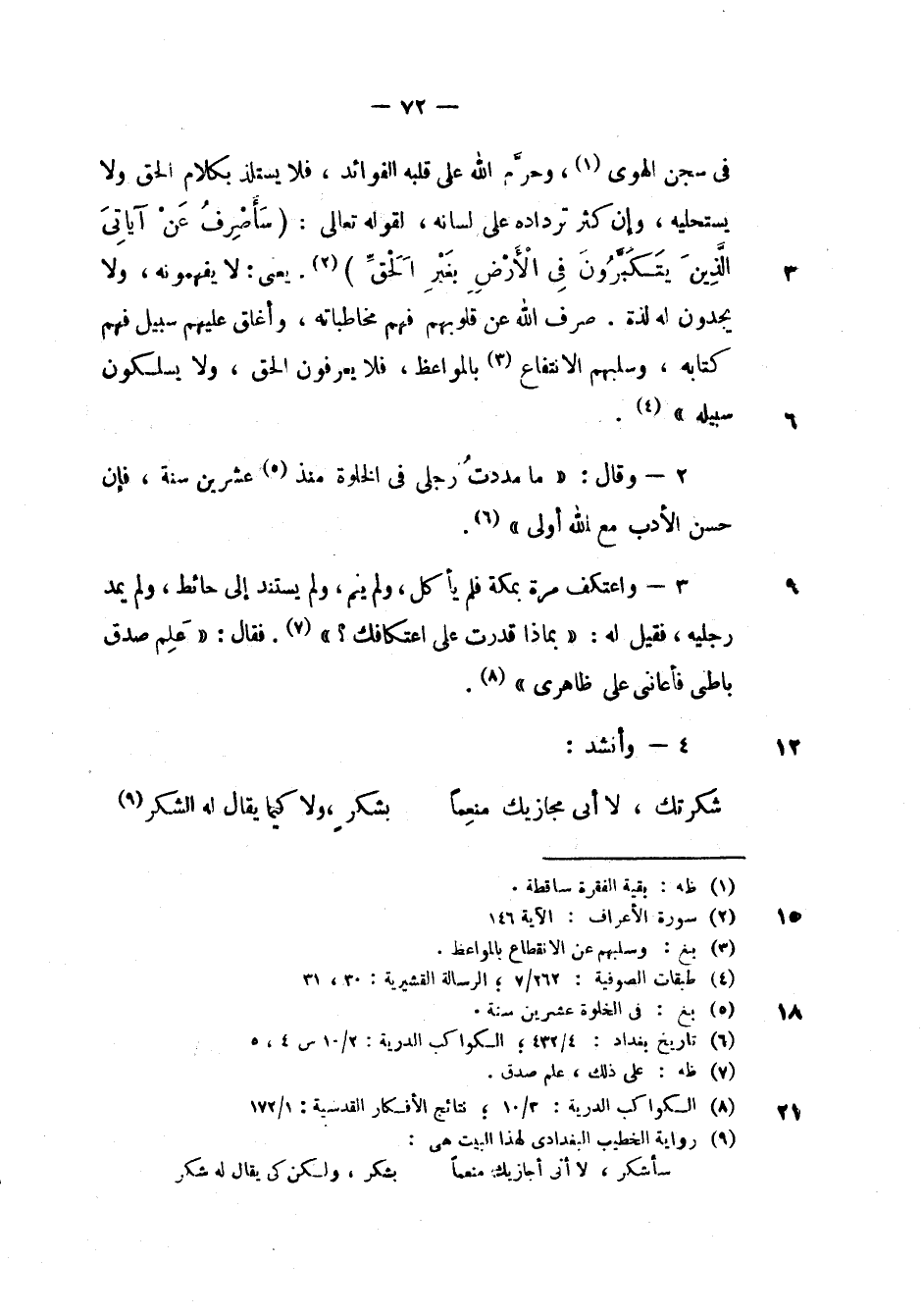 واعتكف مرة بمكة فلم يأكل، ولم ينم، ولم يستند إلى حائط، ولم يمد رجليه، فقيل: " بماذا قدرت على اعتكافك؟ ". فقال: " علم صدق باطني فأعانني على ظاهري ".