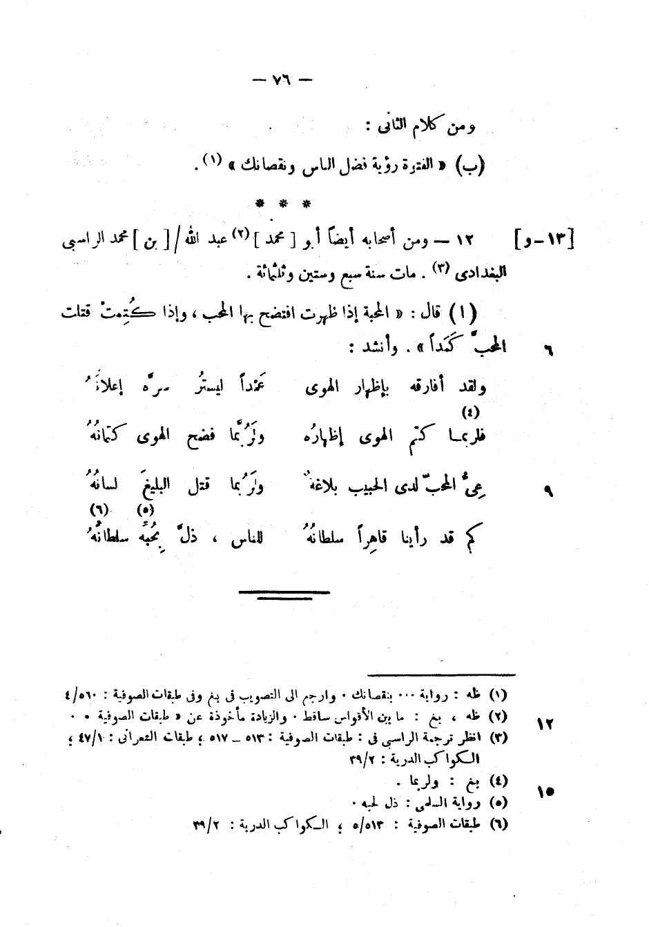 قال: " المحبة إذا ظهرت افتضح بها الحب، وإذا كتمت قتلت المحب كمداً ". وأنشد: