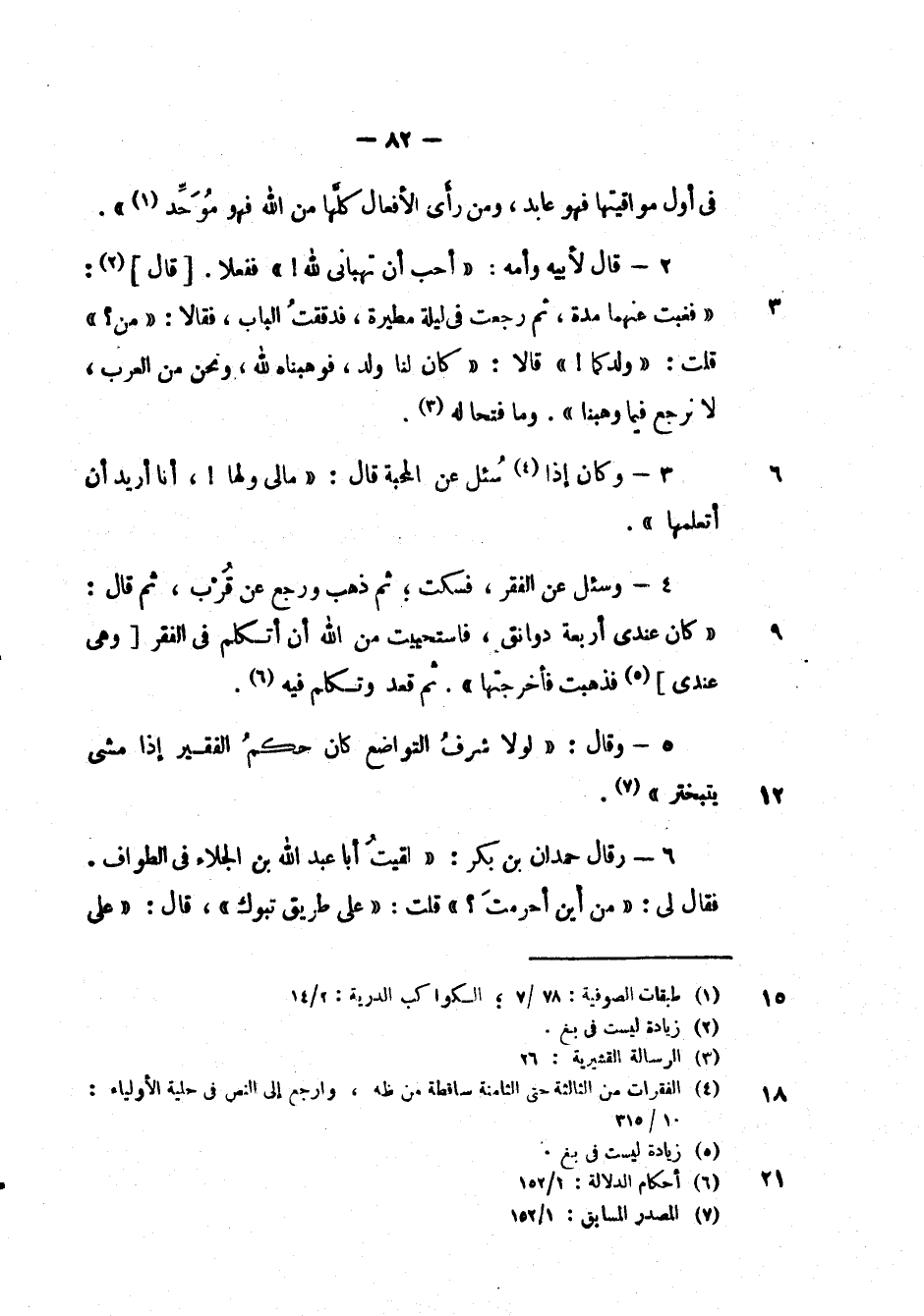 قال لأبيه وأمه: " أحب أن تهباني لله! " ففعلا.) قال (: " فغبت عنهما مدة، ثم رجعت في ليلة ممطرة، فدققت الباب، فقالا: " من؟ " قلت: " ولدكما! " قالا: " كان لنا ولد، فوهبناه لله، ونحن من العرب، لا نرجع فيما وهبنا ". وما فتحا له.