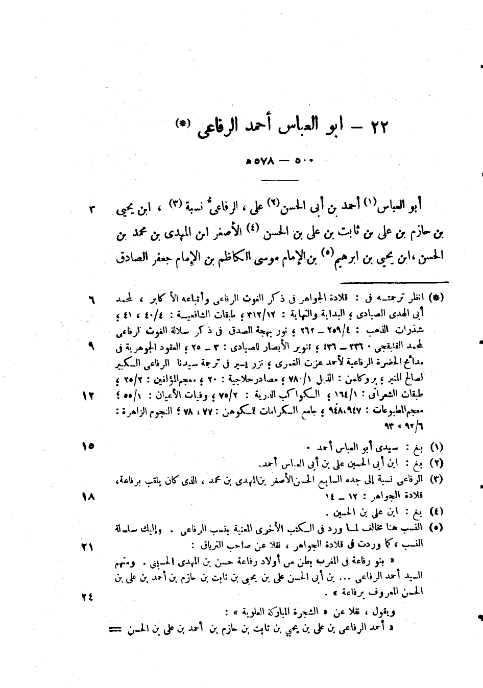 أبو العباس أحمد بن أبى الحسن على، الرفاعي نسبة، ابن يحيى بن حازم بن على بن ثابت بن على بن الحسن الأصغر ابن المهدى بن محمد بن الحسن، ابن يحيى بن ابرهيم بن الإمام موسى الكاظم بن الإمام جعفر الصادق