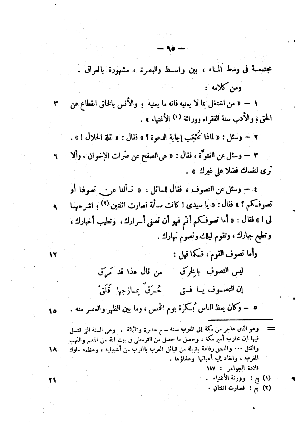 وسئل عن التصوف، فقال للسائل: " تسألنا عن تصوفنا أو تصوفكم؟ " فقال: " يا سيدي! كانت مسألة فصارت اثنتين؛ اشرحهما لي! " فقال: " أما تصوفكم أنتم فهو أن تصفي أسرارك، وتطيب أخبارك، وتطيع جبارك، وتقوم ليلك وتصوم نهارك.