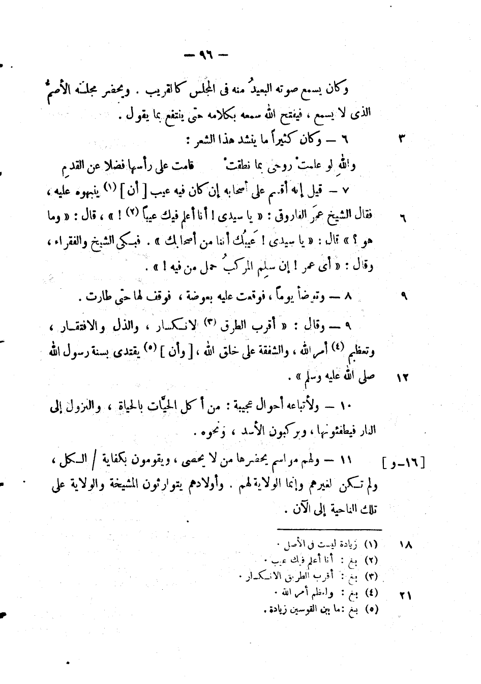 قيل إنه أقسم على أصحابه إن كان فيه عيب أن ينبهوه عليه، فقال الشيخ عمر الفاروقي: " يا سيدي! أنا أعلم فيك عيباً! "، قال: " وما هو؟ " قال: " يا سيدي! عيبك أننا من أصحابك ". فبكى الشيخ والفقراء، وقال: " أي عمر! إن سلم المركب حمل من فيه! ".