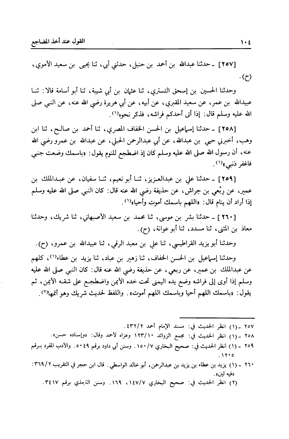 260 - حَدَّثَنَا بِشْرُ بْنُ مُوسَى، ثنا مُحَمَّدُ بْنُ سَعِيدٍ الْأَصْبَهَانِيُّ، ثنا شَرِيكٌ، وَحَدَّثَنَا مُعَاذُ بْنُ الْمُثَنَّى، ثنا مُسَدَّدٌ، ثنا أَبُو عَوَانَةَ، ح وَحَدَّثَنَا أَبُو يَزِيدَ الْقَرَاطِيسِيُّ، ثنا عَلِيُّ بْنُ مَعْبَدٍ الرَّقِّيُّ، ثنا عُبَيْدُ اللَّهِ بْنُ عَمْرٍو، ح وَحَدَّثَنَا إِسْمَاعِيلُ بْنُ الْحَسَنِ الْخَفَّافُ، ثنا زُهَيْرُ بْنُ عَبَّادٍ، ثنا يَزِيدُ بْنُ عَطَاءٍ، كُلُّهُمْ عَنْ عَبْدِ الْمَلِكِ بْنِ عُمَيْرٍ، عَنْ رِبْعِيٍّ، عَنْ حُذَيْفَةَ، رَضِيَ اللَّهُ عَنْهُ قَالَ: §كَانَ النَّبِيُّ صَلَّى اللهُ عَلَيْهِ وَسَلَّمَ إِذَا أَوَى إِلَى فِرَاشِهِ وَضَعَ يَدَهُ الْيُمْنَى تَحْتَ خَدِّهِ الْأَيْمَنِ وَاضْطَجَعَ عَلَى شِقِّهِ الْأَيْمَنِ، ثُمَّ يَقُولُ: بِاسْمِكَ اللَّهُمَّ أَحْيَا وَبِاسْمِكَ اللَّهُمَّ أَمُوتُ " وَاللَّفْظُ لِحَدِيثِ شَرِيكٍ وَهُوَ أَتَمُّهَا