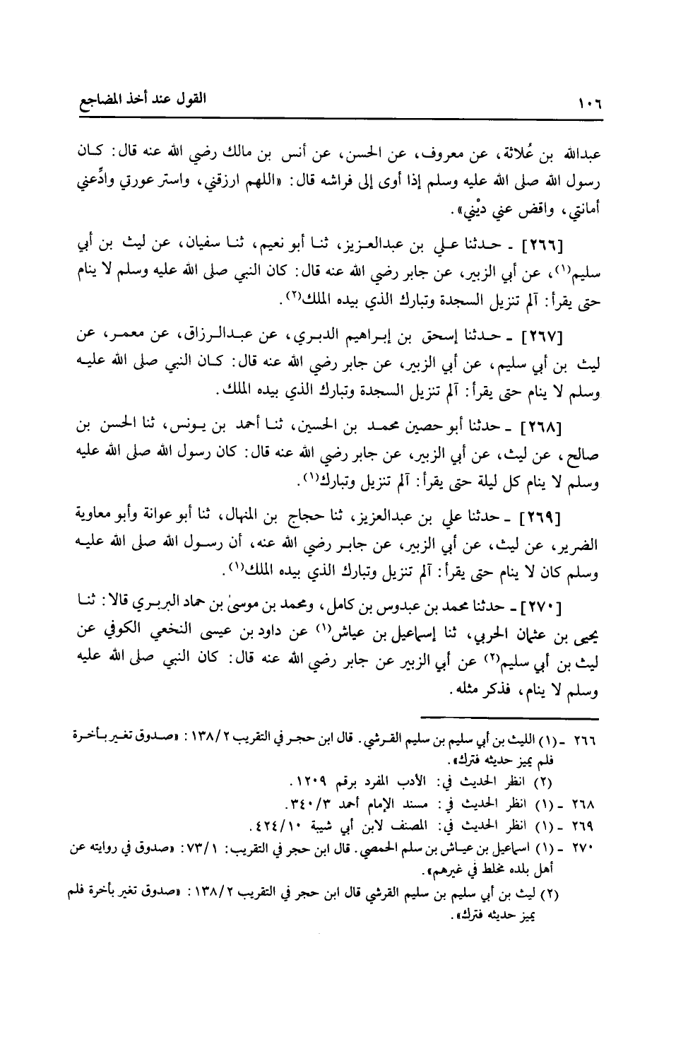 269 - حَدَّثَنَا عَلِيُّ بْنُ عَبْدِ الْعَزِيزِ، ثنا حَجَّاجُ بْنُ الْمِنْهَالِ، ثنا أَبُو عَوَانَةَ، وَأَبُو مُعَاوِيَةَ الضَّرِيرُ، عَنْ لَيْثٍ، عَنْ أَبِي الزُّبَيْرِ، عَنْ جَابِرٍ، رَضِيَ اللَّهُ عَنْهُ «أَنَّ رَسُولَ اللَّهِ صَلَّى اللهُ عَلَيْهِ وَسَلَّمَ كَانَ §لَا يَنَامُ حَتَّى يَقْرَأَ الم تَنْزِيلُ، وَتَبَارَكَ الَّذِي بِيَدِهِ الْمُلْكُ»