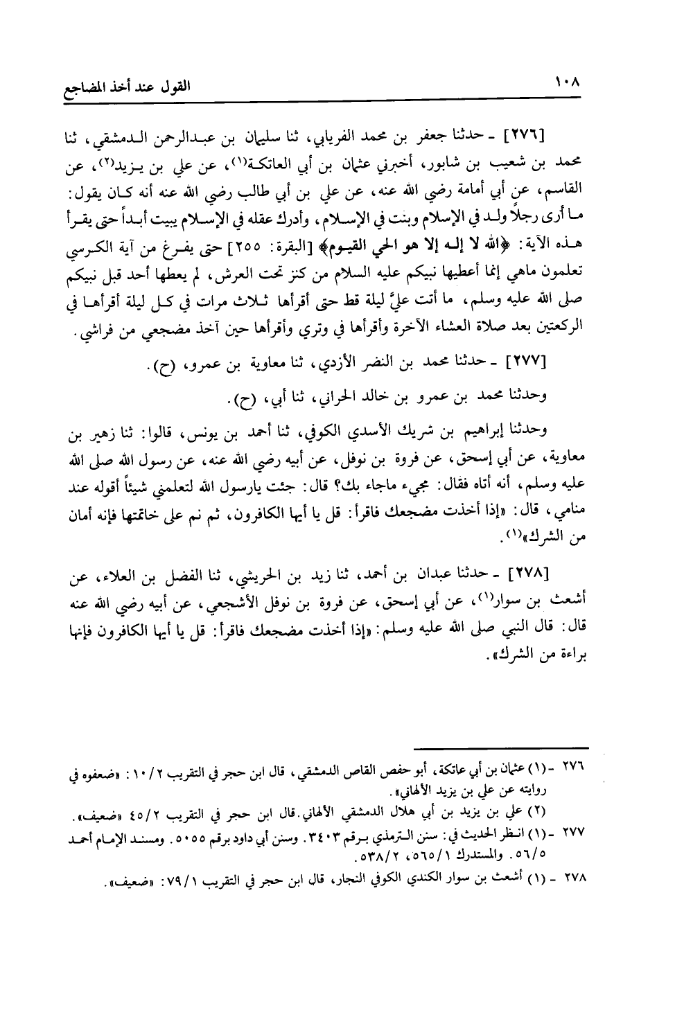 278 - حَدَّثَنَا عَبْدَانُ بْنُ أَحْمَدَ، ثنا زَيْدُ بْنُ الْحَرِيشِ، ثنا الْفَضْلُ بْنُ الْعَلَاءِ، عَنْ أَشْعَثَ بْنِ سَوَّارٍ، عَنْ أَبِي إِسْحَاقَ، عَنْ فَرْوَةَ بْنِ نَوْفَلٍ الْأَشْجَعِيِّ، عَنْ أَبِيهِ، رَضِيَ اللَّهُ عَنْهُ قَالَ: قَالَ النَّبِيُّ صَلَّى اللهُ عَلَيْهِ وَسَلَّمَ: «§إِذَا أَخَذْتَ مَضْجَعَكَ فَاقْرَأْ قُلْ يَا أَيُّهَا الْكَافِرُونَ فَإِنَّهَا بَرَاءَةٌ مِنَ الشِّرْكِ»