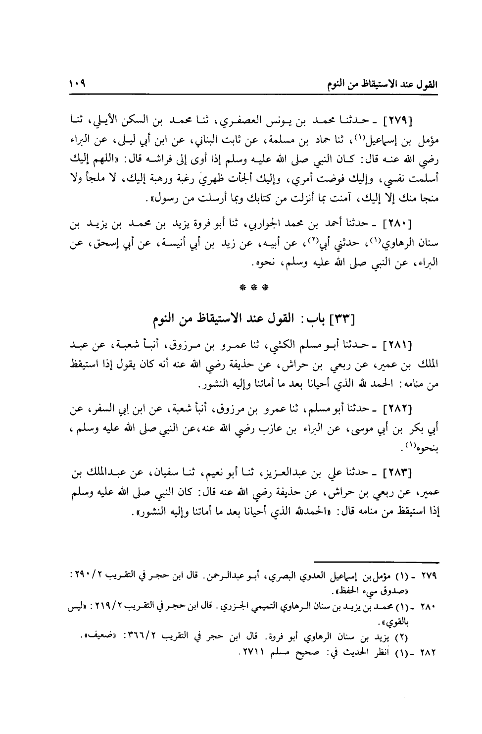 279 - حَدَّثَنَا مُحَمَّدُ بْنُ يُونُسَ الْعُصْفُرِيُّ، ثنا مُحَمَّدُ بْنُ السَّكَنٍ الْأَيْلِيُّ، ثنا مُؤَمَّلُ بْنُ إِسْمَاعِيلَ، ثنا حَمَّادُ بْنُ سَلَمَةَ، عَنْ ثَابِتٍ الْبُنَانِيِّ، عَنِ ابْنِ أَبِي لَيْلَى، عَنِ الْبَرَاءِ، رَضِيَ اللَّهُ عَنْهُ قَالَ: كَانَ النَّبِيُّ صَلَّى اللهُ عَلَيْهِ وَسَلَّمَ إِذَا أَوَى إِلَى فِرَاشِهِ قَالَ: «اللَّهُمَّ §إِلَيْكَ أَسْلَمْتُ نَفْسِي، وَإِلَيْكَ فَوَّضْتُ أَمْرِي، وَإِلَيْكَ أَلْجَأْتُ ظَهْرِي، رَغْبَةً وَرَهْبَةً إِلَيْكَ، لَا مَلْجَأَ وَلَا مَنْجَا مِنْكَ إِلَّا إِلَيْكَ، آمَنْتُ بِمَا أَنْزَلْتَ مِنْ كِتَابِكَ، وَبِمَا أَرْسَلْتَ مِنْ رَسُولٍ»