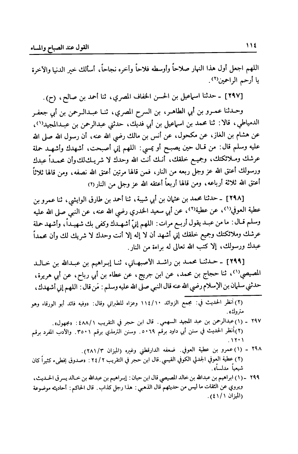 297 - حَدَّثَنَا إِسْمَاعِيلُ بْنُ الْحَسَنِ الْخَفَّافُ الْمِصْرِيُّ، ثنا أَحْمَدُ بْنُ صَالِحٍ، ح وَحَدَّثَنَا عَمْرُو بْنُ أَبِي الطَّاهِرِ بْنُ السَّرْحِ الْمِصْرِيُّ، ثنا عَبْدُ الرَّحْمَنِ بْنُ أَبِي جَعْفَرٍ الدِّمْيَاطِيُّ، قَالَا: ثنا مُحَمَّدُ بْنُ إِسْمَاعِيلَ بْنِ أَبِي فُدَيْكٍ، حَدَّثَنِي عَبْدُ الرَّحْمَنِ بْنُ عَبْدِ الْمَجِيدِ، عَنْ هِشَامِ بْنِ الْغَازِ، عَنْ مَكْحُولٍ، عَنْ أَنَسِ بْنِ مَالِكٍ، رَضِيَ اللَّهُ عَنْهُ أَنَّ رَسُولَ اللَّهِ صَلَّى اللهُ عَلَيْهِ وَسَلَّمَ قَالَ: " §مَنْ قَالَ حِينَ يُصْبِحُ أَوْ يُمْسِي: اللَّهُمَّ إِنِّي أَصْبَحْتُ، أُشْهِدُكَ وَأُشْهِدُ حَمَلَةَ عَرْشِكَ وَمَلَائِكَتَكَ وَجَمِيعَ خَلْقِكَ أَنَّكَ أَنْتَ اللَّهُ، وَحْدَكَ لَا شَرِيكَ لَكَ وَأَنَّ مُحَمَّدًا عَبْدُكَ وَرَسُولُكَ، أَعْتَقَ اللَّهُ عَزَّ وَجَلَّ رُبُعَهُ مِنَ النَّارِ، فَمَنْ قَالَهَا مَرَّتَيْنِ أَعْتَقَ اللَّهُ نِصْفَهُ، وَمَنْ قَالَهَا ثَلَاثًا أَعْتَقَ اللَّهُ ثَلَاثَةَ أَرْبَاعِهِ، وَمَنْ قَالَهَا أَرْبَعًا أَعْتَقَهُ اللَّهُ عَزَّ وَجَلَّ مِنَ النَّارِ "